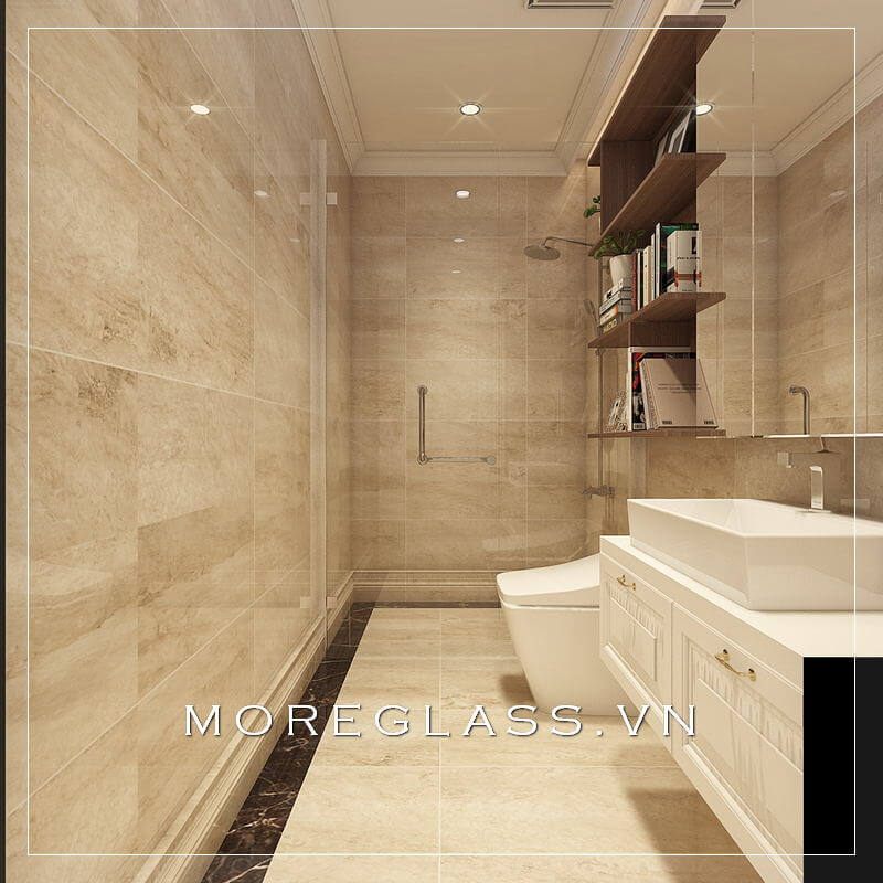 Nhà vệ sinh biệt thự, nhà tắm sử dụng kính kính tắm ngăn chia buồng tiện lợi tạo cảm giác tăng diện tích và rộng rãi hơn.