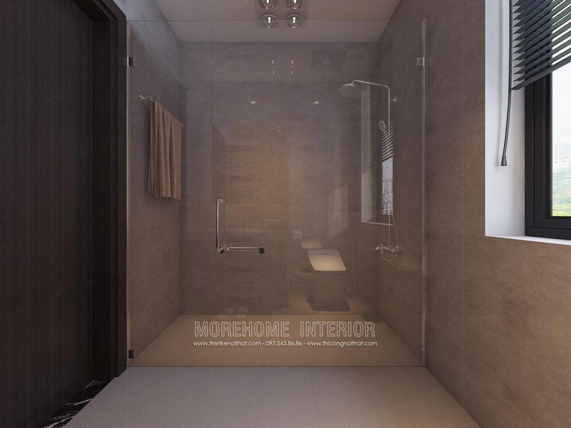 Bố trí nội thất phòng tắm hiện đại, phần cửa sổ được thiết kế với kích thước lớn, kết hợp vách kính cường lực an toàn mang đến cho không gian phòng ngủ thêm phần rộng thoáng hơn cả