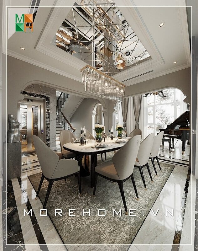 Thiết kế phòng khách tân cổ điển căn hộ chung cư thông tầng đẹp, sang trọng.