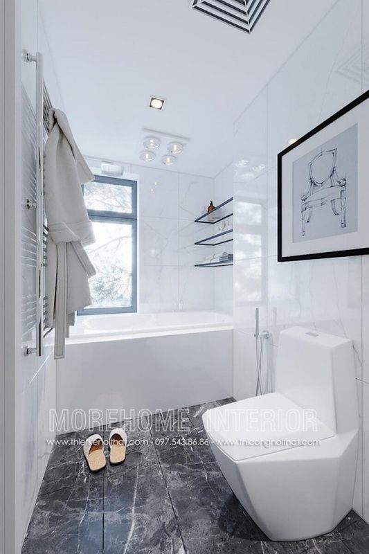 Sắp xếp nội thất phòng tắm đẹp ấn tượng với cửa sổ lớn giúp không gian trở nên thông thoáng hơn.
