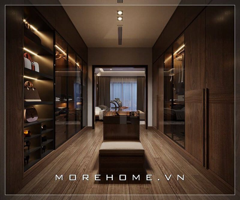 Mẫu thiết kế nội thất biệt thự hiện đại với không gian phòng thay đồ tông màu nâu trầm tinh tế , sử dụng gỗ tự nhiên cao cấp mang đến không gian sống lí tưởng cho gia chủ