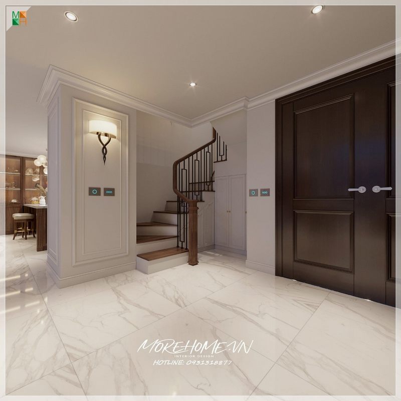 Thiết kế nội thất phòng ăn phòng ăn tân cổ điển đẹp, quý phái với không gian bàn ăn dành cho 10 người nhưng vẫn rộng rãi thông thoáng.