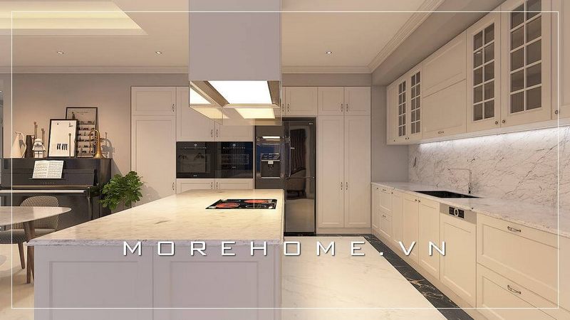 Thiết kế nội thất phòng bếp hiện đại sử dụng tone màu trắng chủ đạo tạo nên không gian tinh tế và tiện nghi