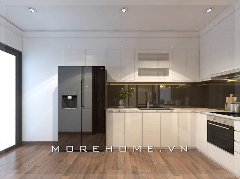 Thiết kế nội thất phòng bếp chung cư hiện đại, sử dụng tone màu trắng chủ đạo mang đến không gian căn bếp tinh tế, trẻ trung và sang trọng hơn