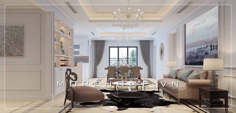 Không gian phòng khách sẽ trở nên tiện nghi hơn với sự trang trí của một kệ trang trí gỗ màu trắng hiện đại.