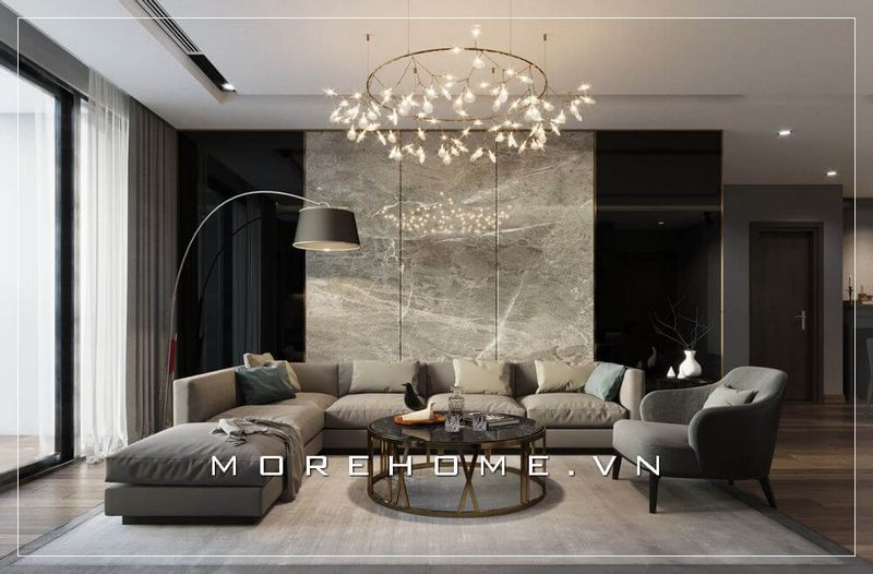 Ghế sofa bọc vải màu xám hiện đại là một lựa chọn thích hợp cho phòng khách chung cư.